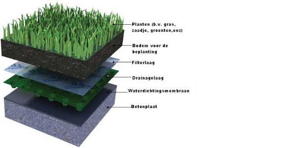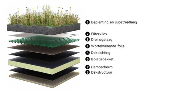 Een groendak is dan ook een bewuste ecologische dakbedekking, het is goed voor het milieu en het geeft het dak van je woning of bedrijf een extra kleurrijke en mooie uitstraling. De invulling van zo’n vegetatiedak kun je daarbij zelf bepalen. Enerzijds kun je gaan voor een extensief groendak, waarbij het groendak meer dienst doet als blikvanger, en anderzijds kun je kiezen voor een intensief groendak, waarbij er veel meer mogelijkheden zijn om je groendak te betreden, te onderhouden of te beplanten met allerhande vegetatie varianten. Het spreekt voor zich dat een groendaken ook een goede structuur nodig hebben, die de nodige ondersteuning geeft aan deze groene dakbedekking. Ook de isolatie van een groendak of daktuin vraagt de nodige aandacht en een groendak opbouw is dan ook werk voor specialisten.